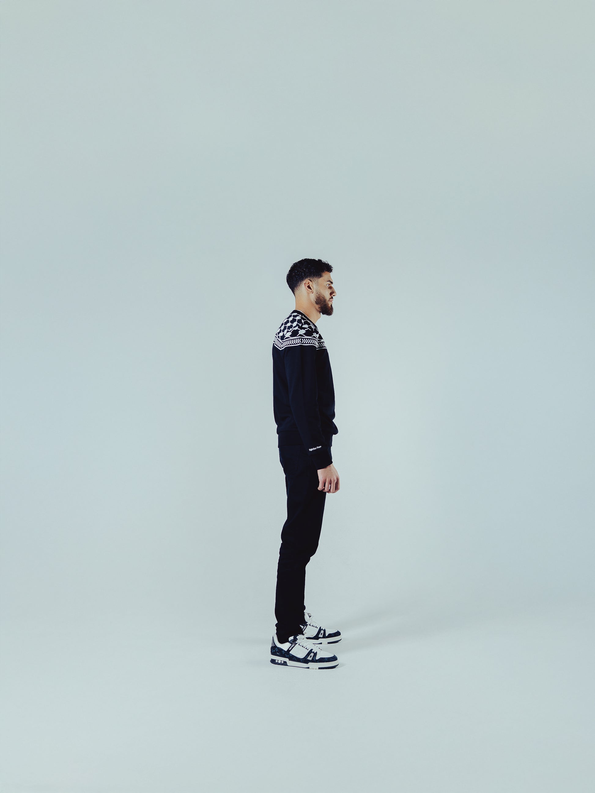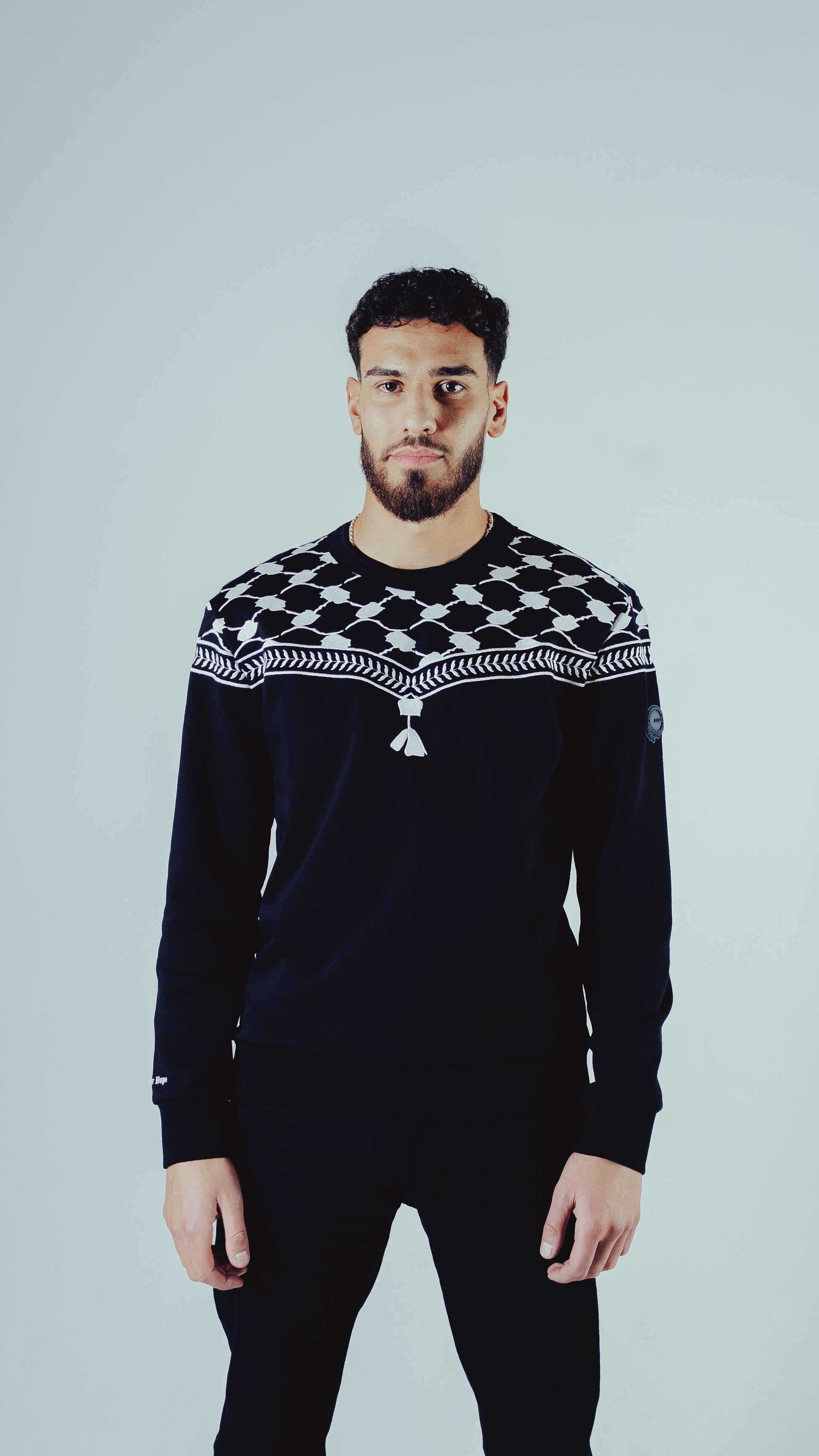 Sweatshirt made from 100% cotton with a regular fit. Features an all-over keffiyeh-inspired pattern in embroidery. Ribbed cuffs, collar, and waistband. True to size.